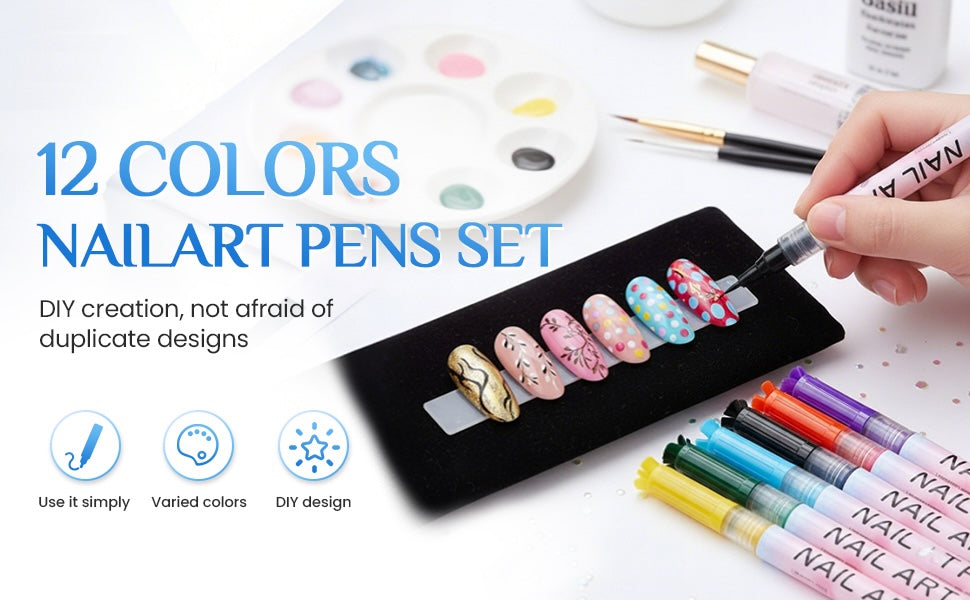 Unleash your creativity with the 12-Color Nail Art Pens Set, designed for effortless detailing and standout results. Each pen features a 0.5 mm ultra-fine precision tip and richly pigmented color, allowing you to create crisp lines, intricate patterns, and professional-level nail art with total control. Whether you’re perfecting minimalist accents or crafting bold 3D nail designs, this set provides everything you need to elevate your manicure at home.